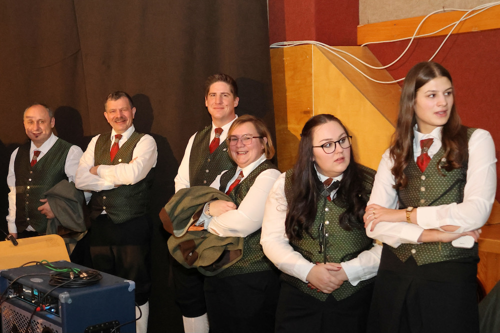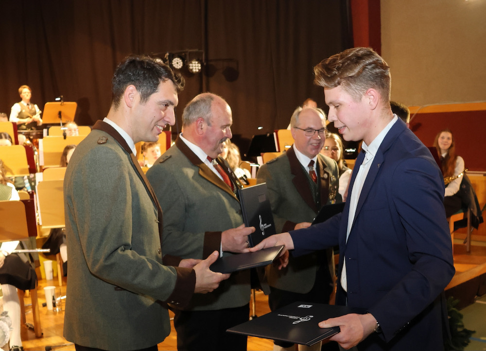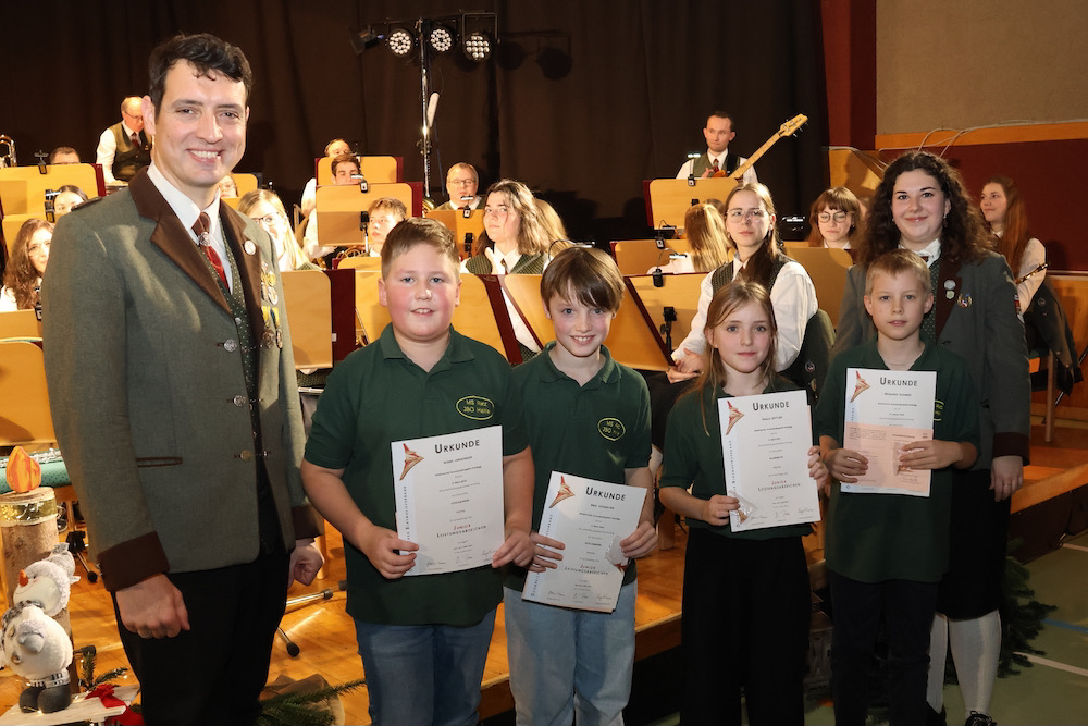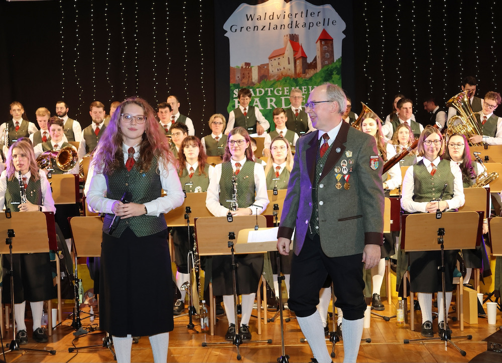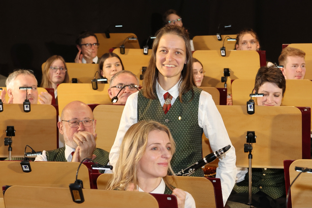Mit dem Konzertmarsch „Sympatria“ des Oberösterreichers Thomas Asanger dirigierte Sophie Kianek die Grenzlandkapelle in die zweite Konzerthälfte. Anschließend wurden folgende Mitglieder offiziell neu in den Verein aufgenommen und vorgestellt: Die JungmusikerInnen (Foto v.l.n.r.): Lara Deckenbach (Flöte), Iris Scheurer und Alina Andre (Klarinette), Leonhard Suppan (Tuba) und Lorenz Müllner (Tenorhorn). Die beiden „Routiniers“ und Träger des Leistungsabzeichen in Gold, Julia Rockenbauer (Klarinette) und Christian Schubert (Tuba), wurden ebenfalls herzlich willkommen geheißen. Ebenso wurde allen MusikschülerInnen zu den abgelegten JungmusikerInnen- und Junior-Leistungsabzeichen des Vorjahres gratuliert.