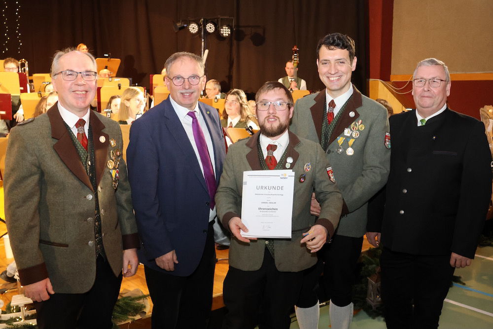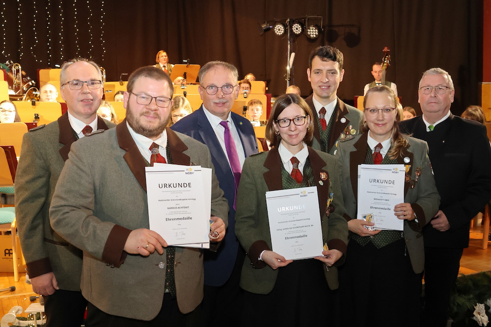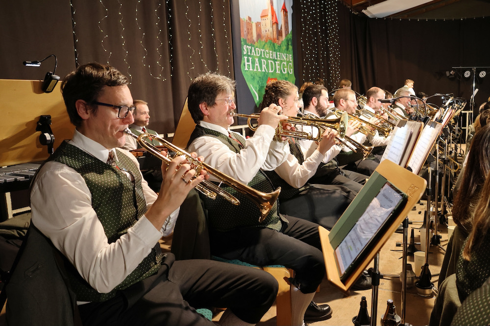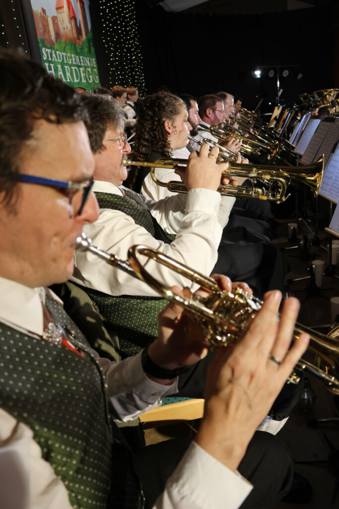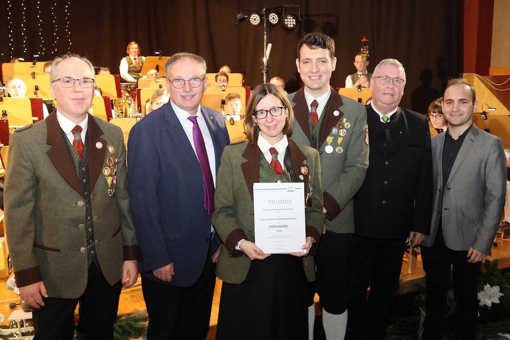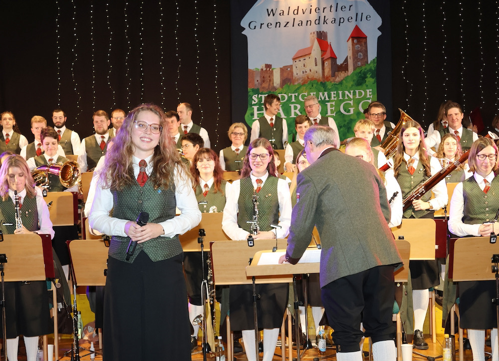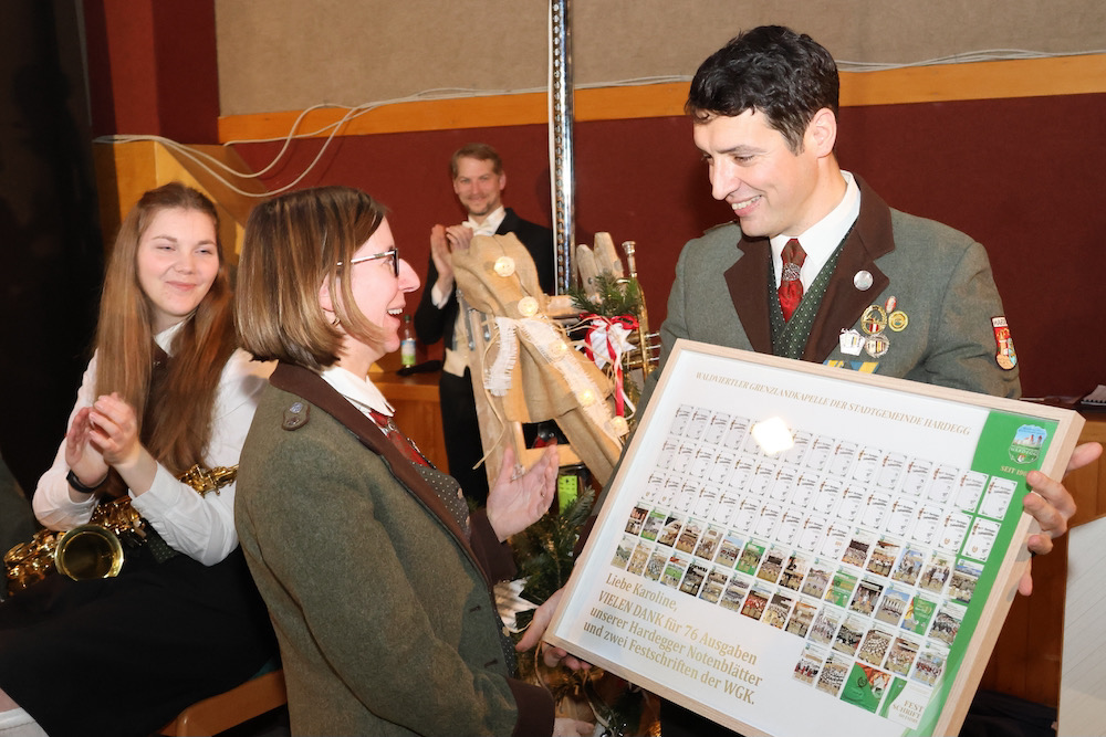 Bezirksobmann Dominik Sommerer überbrachte im ersten Teil auch für langjähriges und verdientes Engagement die Ehrungen des NÖ Blasmusikverbandes: Die „Ehrenmedaille in Bronze“ für 15 Jahre Mitgliedschaft erhielten Katharina Schleifer (Flöte) und Daniel Ziegler (Flügelhorn); die „Ehrenmedaille in Silber“ für 25 Jahre Mitgliedschaft ging an Markus Achtsnit (Trompete), Bernadett Eber (Klarinette) und Karoline Schöbinger-Muck (Flöte). Darüber hinaus wurden die beiden Beiräte Lukas Weitschacher und Daniel Ziegler für ihre zuverlässige Tätigkeit im Vorstand mit dem „Ehrenzeichen“ ausgezeichnet. Karoline Schöbinger-Muck, langjährige Schriftführerin und Redakteurin der „Hardegger Notenblätter“, wurden für ihr Wirken seit 2006 mit über 75 Zeitungsausgaben und 2 Festschriften mit der „Ehrennadel in Silber“ und einer Bilder-Collage Dank und Anerkennung ausgesprochen. Im neuen Jahr werden die Aufgaben an die nächste Generation übergeben.