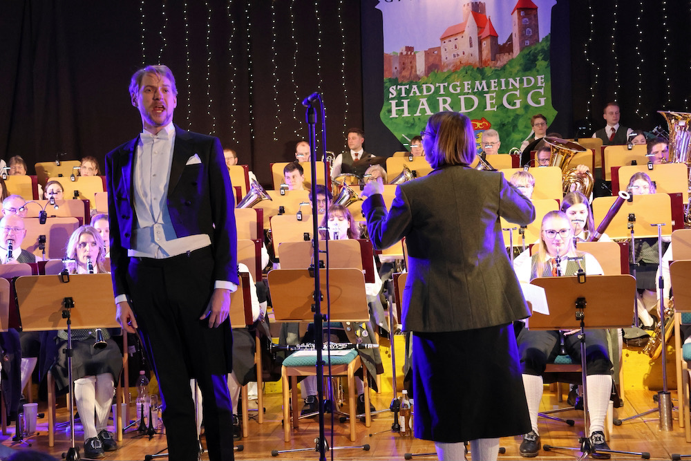 Mit einem der bekanntesten Märsche der Konzertliteratur, mit dem „Florentiner Marsch“ von Julius Fučík wurde das Programm unter der Leitung von Kpm. Johann Pausackerl festlich eröffnet, ehe mit der Ouvertüre zu Robert Stolz’s „Frühjahrsparade“ dessen 50. Todestag 2025 gedacht wurde. Die beiden sinfonischen Werke „Caledonia“ des Schweizers Oliver Waespi und „The Rise of the Blackjack“ des Steirers Gerald Oswald, der als Gastdirigent zu erleben war, erinnerten an die Teilnahme an der Konzertmusikbewertung im Herbst in Zellerndorf. Mit zwei berühmten Opernarien von Giuseppe Verdi aus „Rigoletto“ und „La Traviata“ im Arrangement des mitwirkenden Komponisten Daniel Muck begeisterten die jungen SängerInnen Martin Mairinger (Tenor) und Selina Pausackerl (Sopran) unter der Leitung von Kpm.-Stv. Karoline Schöbinger-Muck das Publikum.